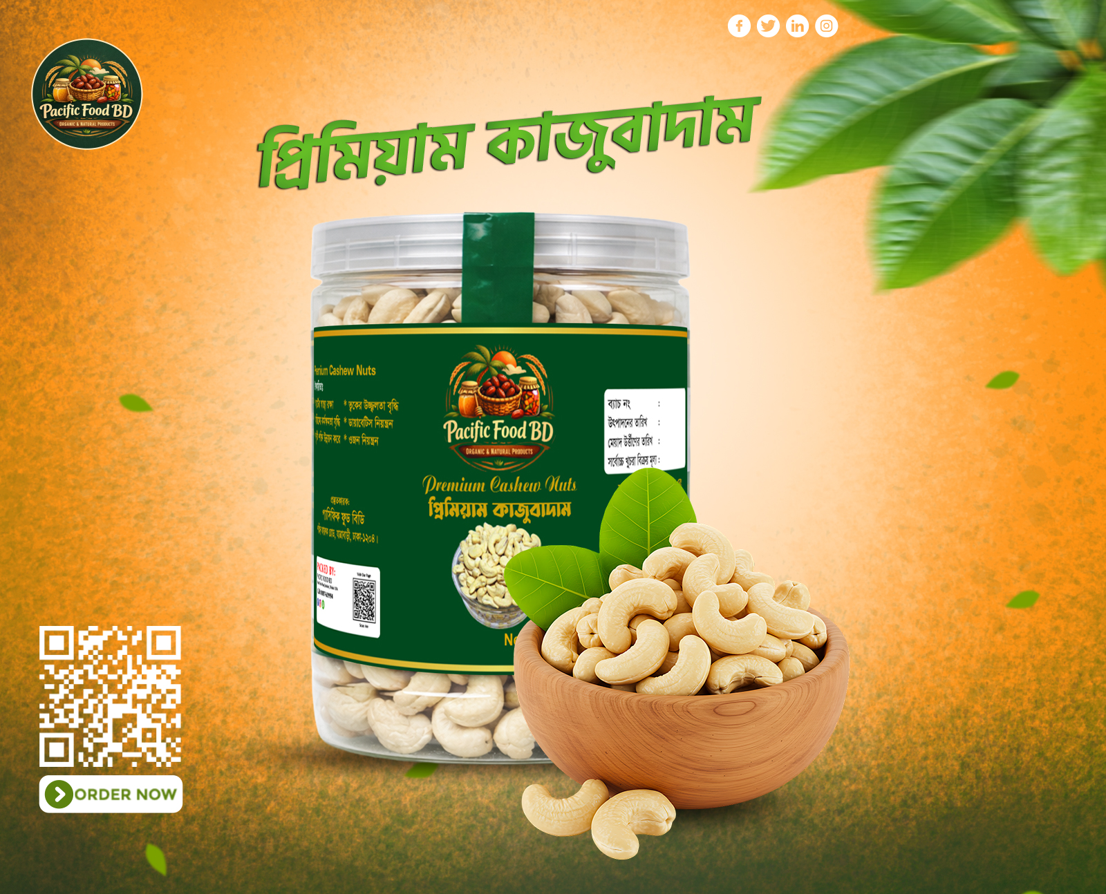 আমাদের প্রিমিয়াম কোয়ালিটির কাজু বাদাম সংগ্রহ করা হয় উন্নতমানের উৎস থেকে, যাতে আপনি পান খাঁটি স্বাদ, উৎকৃষ্ট মান ও সর্বোচ্চ পুষ্টিগুণ। প্রতিটি কাজু বাদাম সতর্কতার সাথে বাছাই ও স্বাস্থ্যসম্মতভাবে প্রক্রিয়াজাত করা হয়, যা আপনার প্রতিদিনের খাদ্যতালিকায় যোগ করবে শক্তি, স্বাদ ও পুষ্টির নিখুঁত সমন্বয়।